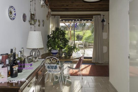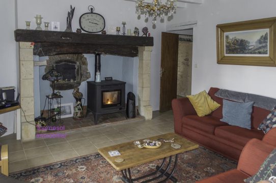 De plain pied un séjour avec poele à bois, une salle à manger, une cuisine équipée, une salle d’eau et des toilettes séparées.
