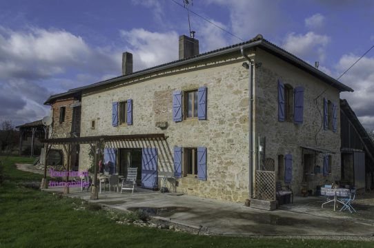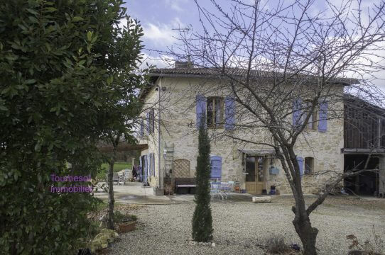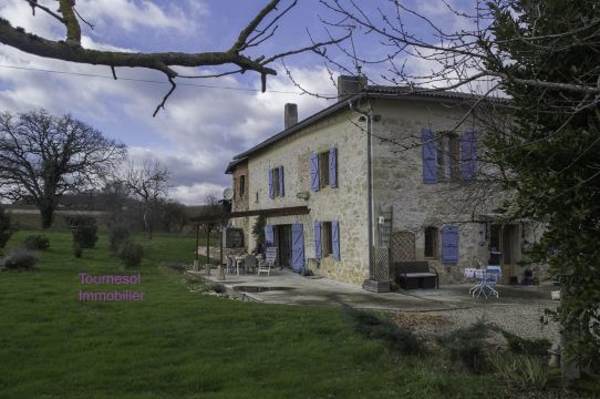 Toute proche d’un joli bourg avec tous commerces et écoles, belle gasconne en pierres avec dépendances sur 1,3 ha en position dominante.