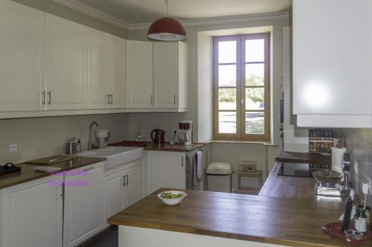 Nicely renovated farm house on 3 ha with lots of outbuildings than can potentially be converted into gites. A large entrance leads you onto a family room with an American fitted kitchen and a lounge room with a fire place equipped with a wood burner, a sitting room with a fire place, 3 bedrooms (2 have got their own shower/bath with toilets), summer kitchen.